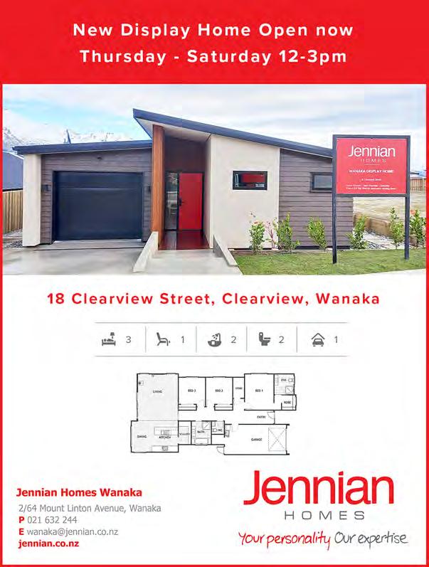 1.00pmSun 4 Dec$1,195,000 104 Hunter Crescent, Wanaka 1.30 - 2.00pmSun 4 DecNegotiation LJ HOOKER 930 Mount Barker Road 10.15 - 10.30amSat 3 Dec Negotiation 89 In nity Drive 11.30am - 12.30pmSat 3 Dec$2,680,000 135 Main Road, Luggate 1.15 - 1.45pmSat 3 DecOver $930,000 NEW ZEALAND SOTHEBY’S INTERNATIONAL REALTY 5 Ruby Ridge, Wanaka 11.00 - 11.30amSat 3 DecDeadline 7/12 66 Lakeview Terrace, Lake Hawea 1.30 - 2.00pmSat 3 DecNegotiation PROPPY.CO.NZ 66 Bills Way, Wanaka 11.00 - 11.30am Sat 3 Dec Negotiation 992 Aubrey Road 11.30 - 12.15pm Sat 3 Dec Deadline 15/12 137 Meadowstone Drive 1.00 - 1.30pm Sat 3 Dec Deadline 8/12 69 Frye Crescent, Wanaka 2.00 - 2.30pm Sat 3 Dec Deadline 7/12 G.J. GARDNER HOMES 13 Alpha Street, Cromwell 1.00 - 4.00pm Wed - SunShowhome 22 Glen Dene Crescent, Wanaka 1.00 - 4.00pm Wed - SunShowhome STONEWOOD HOMES 14 Campbell Road, Alpine Estate 12.00 - 3.00pm Sat 3 DecShow Home 29 Pounamu Avenue, Hikuwai 12.00 - 3.00pm Sun 4 DecShow Home JENNIAN HOMES 18 Clearview Street, Clearview 12.00 - 3.00pmThu - SatShow Home