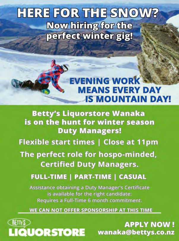 Start 11.15am, seated 11.00am. Social. Bring lunch. Rotary Club of Wanaka. 6.00pm, The Albie Tavern. New members welcome. Pat He ernan 021 569 890. Steady as you go Body Balance Class. 1.00pm and 2.00pm. St John Room, Link Way. All welcome. Entry $3. 027 2851 095. Parkinson’s Exercise Class 11.00am - 12.15pm Wanaka Rec Centre. Contact Ashley 022 0311 415.