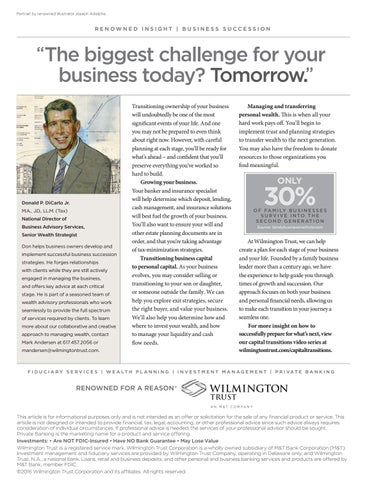 Donald P. DiCarlo Jr. M.A., J.D., LL.M. (Tax) National Director of Business Advisory Services, Senior Wealth Strategist Don helps business owners develop and implement successful business succession strategies. He forges relationships with clients while they are still actively engaged in managing the business, and offers key advice at each critical stage. He is part of a seasoned team of wealth advisory professionals who work seamlessly to provide the full spectrum of services required by clients. To learn more about our collaborative and creative approach to managing wealth, contact Mark Andersen at 617.457.2056 or mandersen@wilmingtontrust.com.