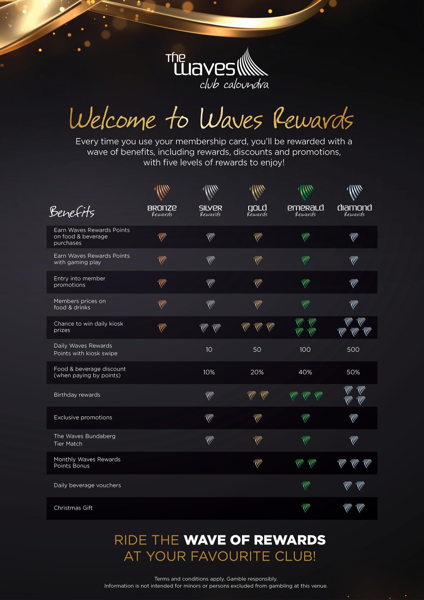 The Waves Rewards Program is in full swing Our members are now being rewarded across both food and beverage as well as gaming. Don’t forget to use your membership card with every purchase on food and beverage to be rewarded with a wave of benefits, including rewards, discounts, and promotions, with five levels of rewards to enjoy! The program has been designed to reward every member of the club See page 13formoreinformation.