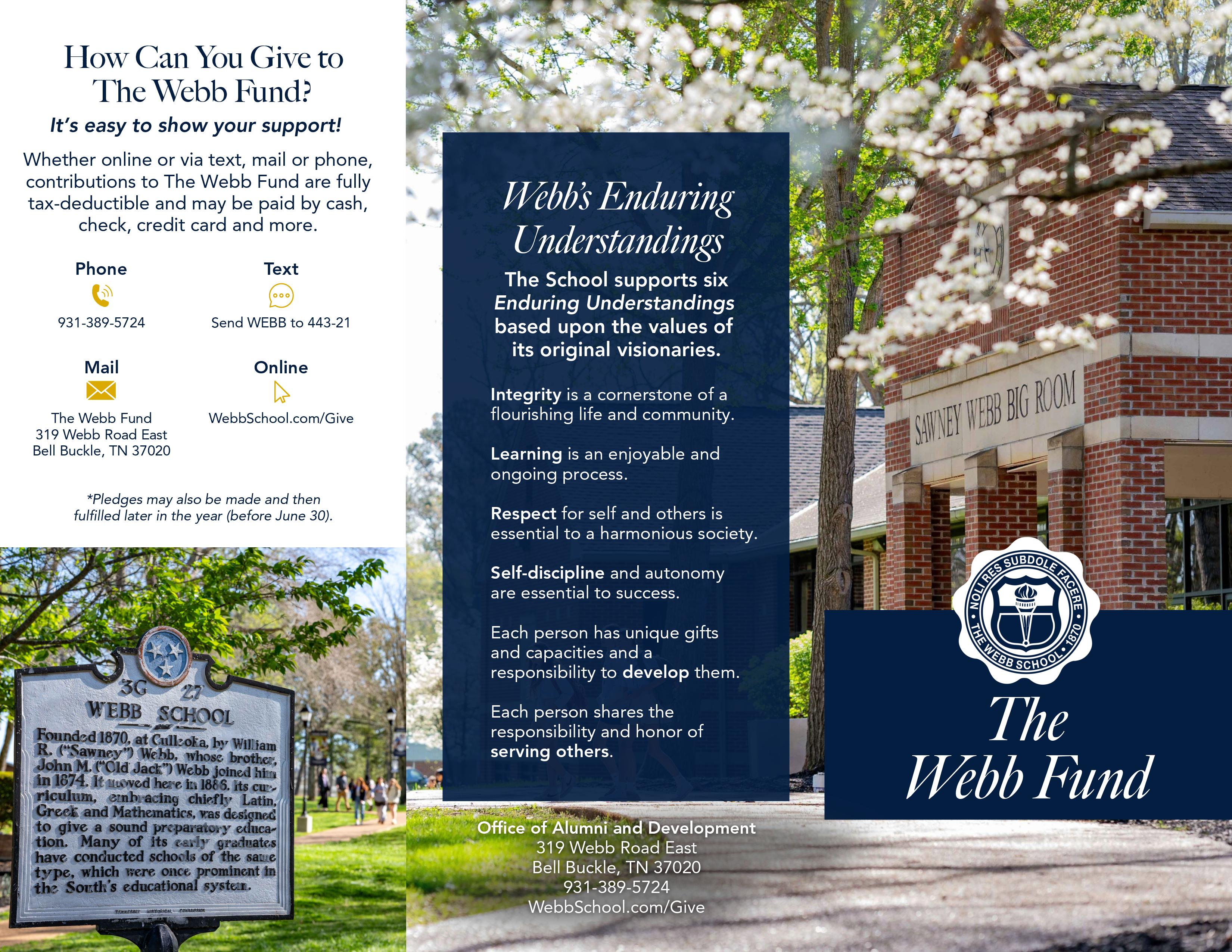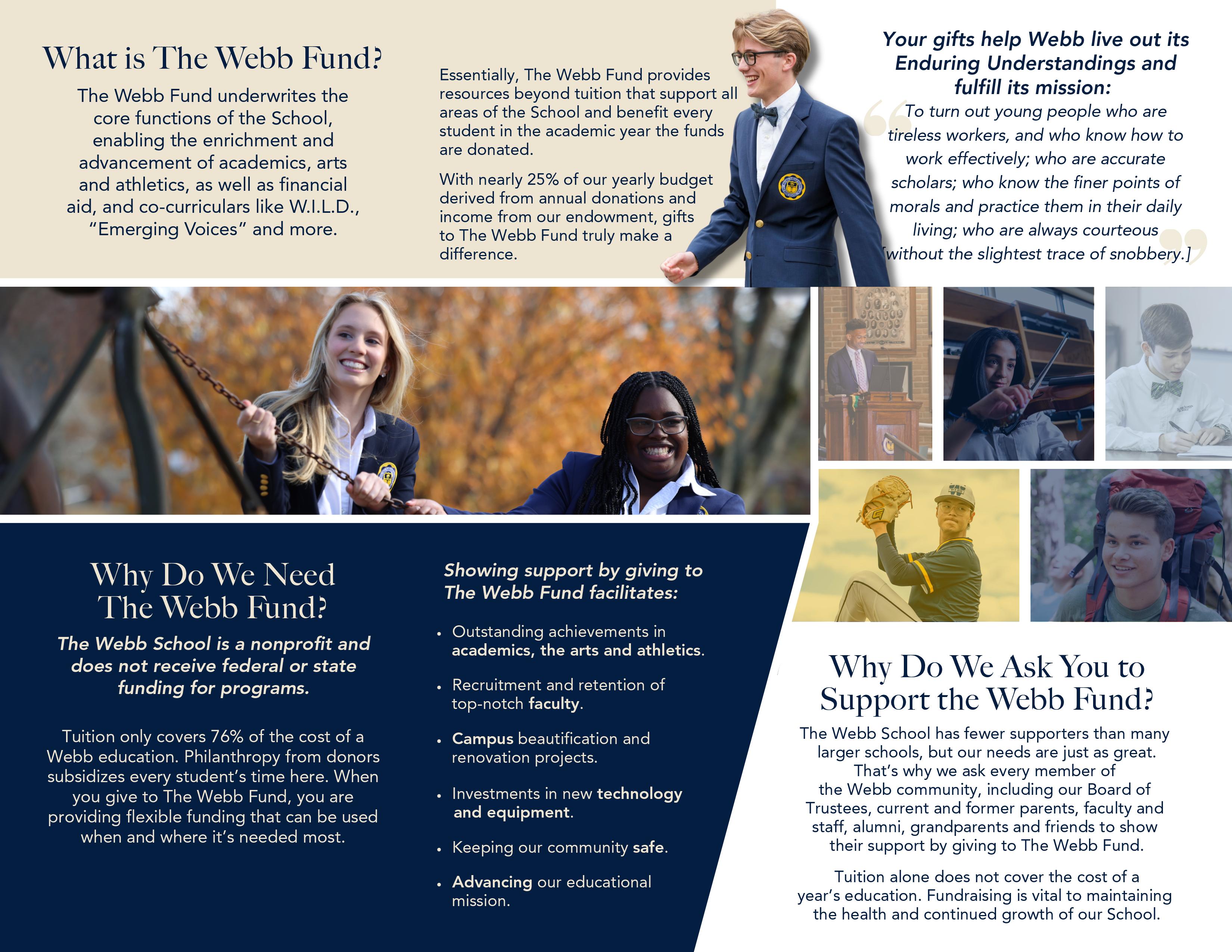 The Webb Fund provides resources beyond tuition that support all areas of the School and benefit all students in the academic year the funds are donated. With nearly 25% of our yearly budget derived from annual donations and income from our endowment, gifts to The Webb Fund truly make a difference.