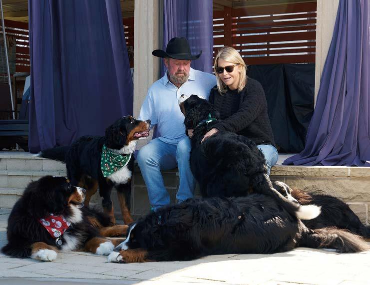 Dr. Parker and her husband, Brett Parker, with several of their dogs, Miss Mabel Anne, Mr. Darcy, Don Huckleberry, Captain Augustus, General Sherman, Señor Bevo, Señorita Bella Star and The Earl of Flanders Farm.