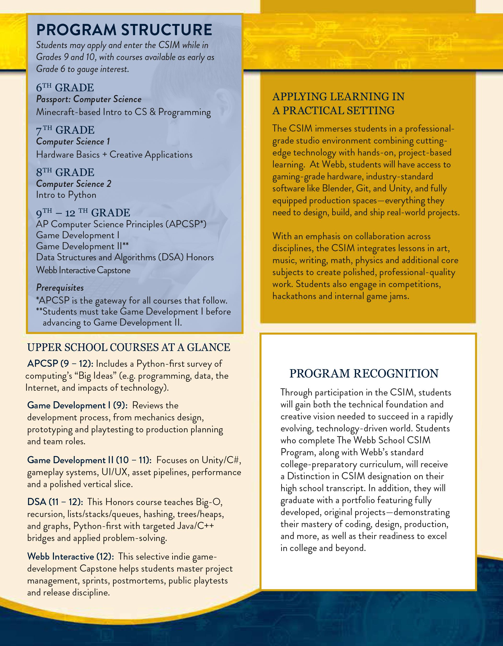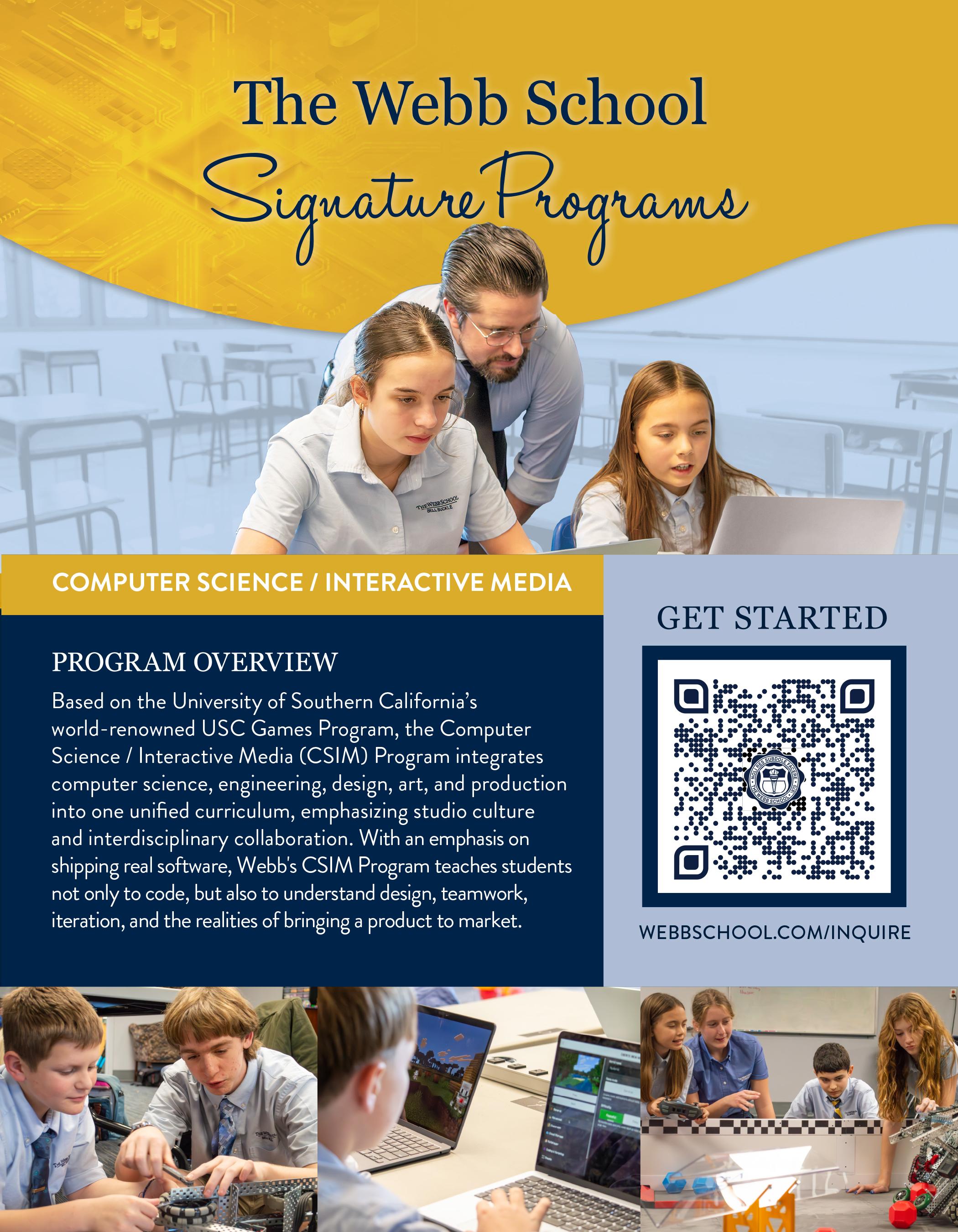 The Computer Science / Interactive Media (CSIM) Program — inspired by the University of Southern California’s world-renowned USC Games Program — teaches students not only to code but also to understand design, teamwork, iteration and the realities of bringing a product to market. With classes beginning as early as the sixth grade, students who complete this program will earn a Distinction in CSIM designation with their Webb diploma and possess a portfolio of fully developed, original projects demonstrating their mastery of coding, design, production, and more.