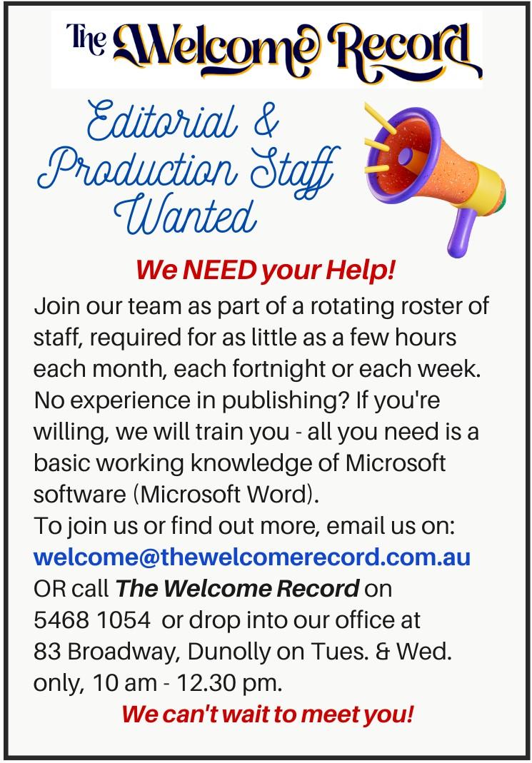 Contact via Dunolly Neighbourhood Centre: admin@dunnhc.com.au 54681511.