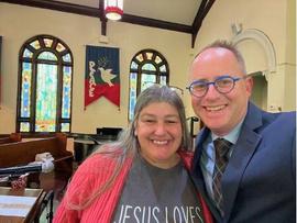 Executive Director Brian Henderson is here greeted by congregational leader, Mary Ann Robinson at The Baptist Church of the Great Valley, Devon, PA.