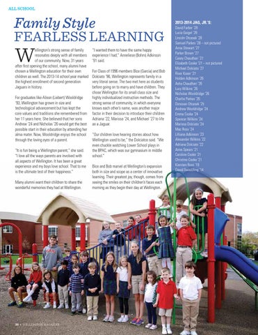 ellington’s strong sense of family resonates deeply with all members of our community. Now, 31 years after first opening the school, many alumni have chosen a Wellington education for their own children as well. The 2013-14 school year marked the highest enrollment of second generation Jaguars in history. For graduates like Alison (Liebert) Wooldridge ‘93, Wellington has grown in size and technological advancement but has kept the core values and traditions she remembered from her 11 years here. She believed that her sons Andrew ’24 and Nicholas ’26 would get the best possible start in their education by attending her alma mater. Now, Wooldridge enjoys the school through the loving eyes of a parent. “It is fun being a Wellington parent,” she said. “I love all the ways parents are involved with all aspects of Wellington. It has been a great experience and my boys love school. That to me is the ultimate test of their happiness.” Many alumni want their children to share the wonderful memories they had at Wellington.