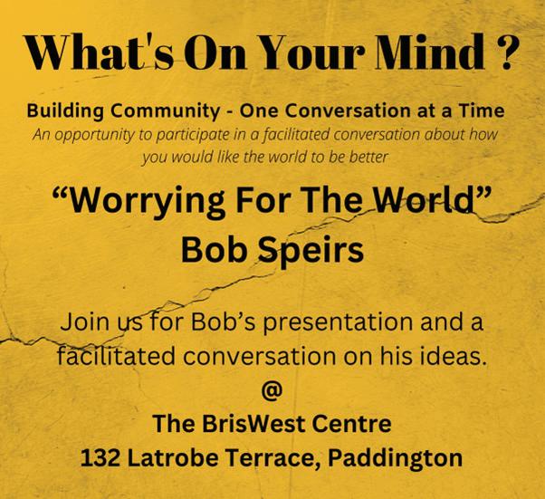 The next gathering, on Saturday 6 December at 1.30pm, will take on a topic that resonates with many of us: Worrying for the World. With temperatures rising and anxiety increasing, guest speaker Bob Speirs - a climate science expert who has spoken twice before at BrisWest Centre - will join the group to share insights from his recent paper and explore how communities can face the changes arising from global warming in our communities and ways of life.