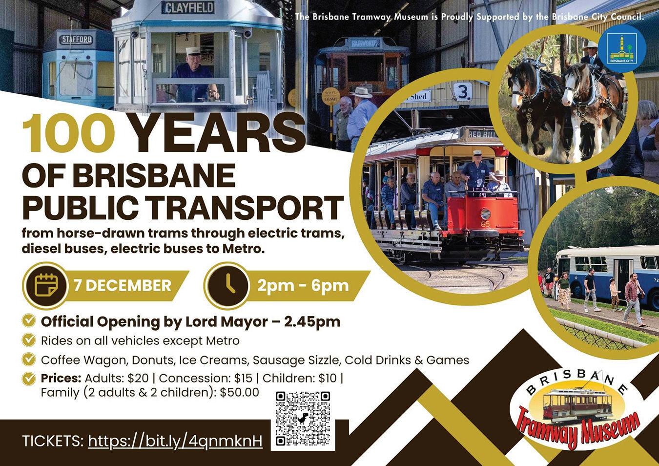 Tram rides will be available throughout the afternoon and local joy rides will be available on diesel buses and electric buses. Unfortunately, the museum is a little out of range for the Metro. Advance bookings and tickets are available on Eventbrite or on the Museum website. See the ad in this edition. Tickets: www. eventbrite.com.au/e/100-years-of-brisbane-public-transporttickets-1855639410429