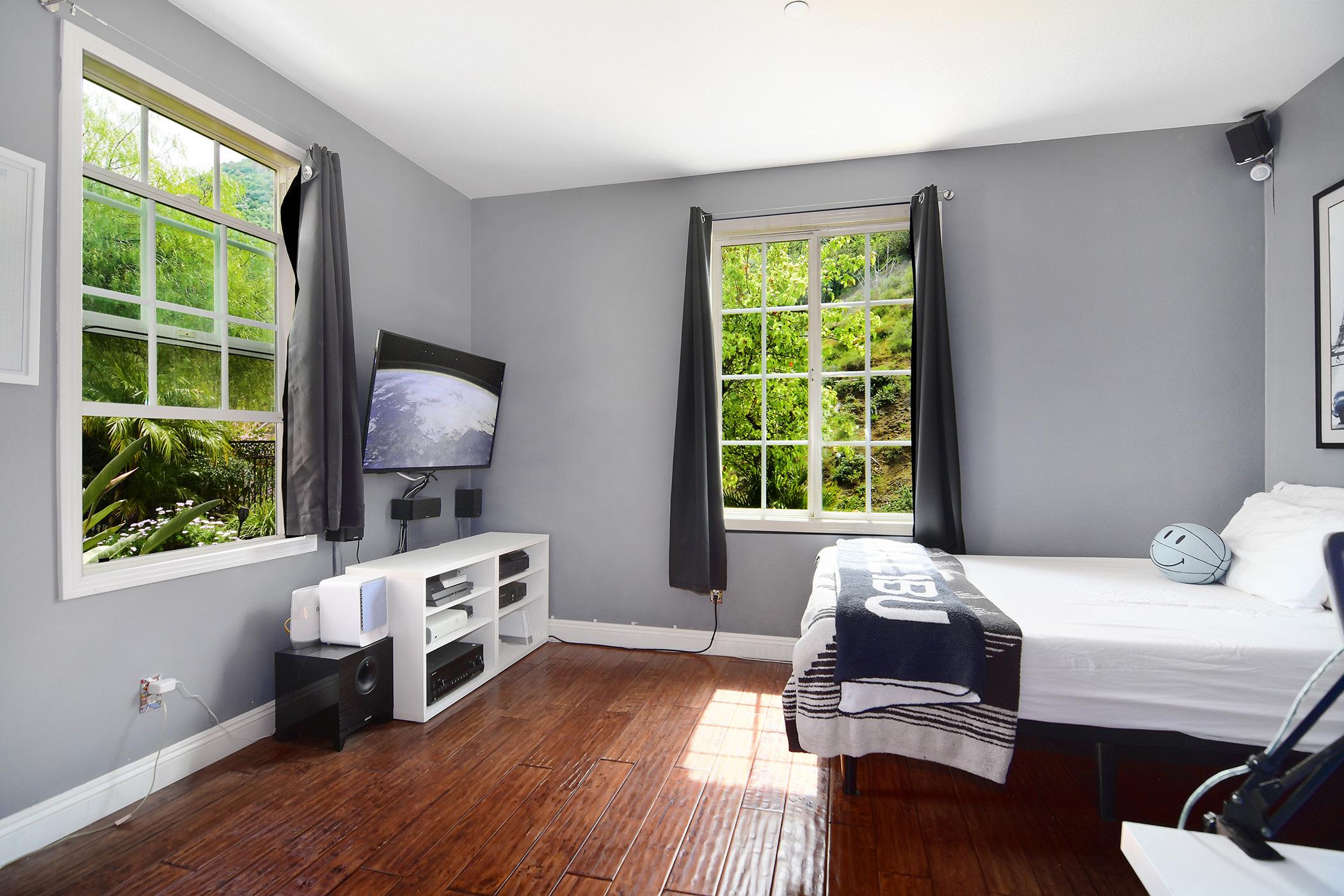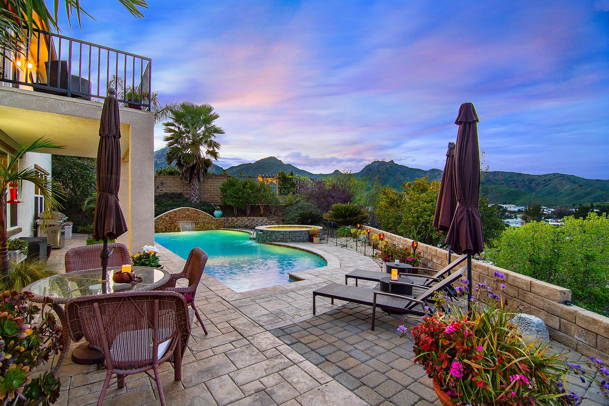 Nestled in the heart of Malibu Wine Country, this exquisite estate offers a harmonious blend of luxurious living and natural beauty. With five bedrooms and four baths, this sprawling residence is perched atop a serene knoll, boasting breathtaking panoramic views of majestic mountains that stretch as far as the eye can see. Step outside onto the expansive patio and take in the mesmerizing scenery while relaxing in the pool or unwinding in the bubbling hot spa. The generous yard, adorned with numerous fruit trees, invites outdoor activities and al fresco dining against the backdrop of stunning sunrises and sunsets painting the sky. Situated on a ridge overlooking the valley, this home provides an enchanting setting with evening silhouettes of the hills, offering a sense of tranquility and serenity. Just a stone's throw away, discover scenic trails, the pristine shores of Zuma Beach, and convenient access to the 101 freeway for easy commuting. Equipped with solar panels and a Tesla charging unit, this eco-friendly oasis embraces sustainability while providing modern convenience. Immerse yourself in the natural surroundings, whether it's savoring the delights of nearby dining destinations like the Rock Store and the Old Place or simply reveling in the symphony of birdsong and stargazing under the clear night sky. Indulge in the seamless indoor/outdoor living experience, where expansive doors dissolve the boundaries between the interior and exterior, allowing you to fully embrace the beauty of nature from the comfort of your own home. Escape the hustle and bustle of city life and embrace a lifestyle where every moment is an opportunity to connect with the wonders of the natural world.