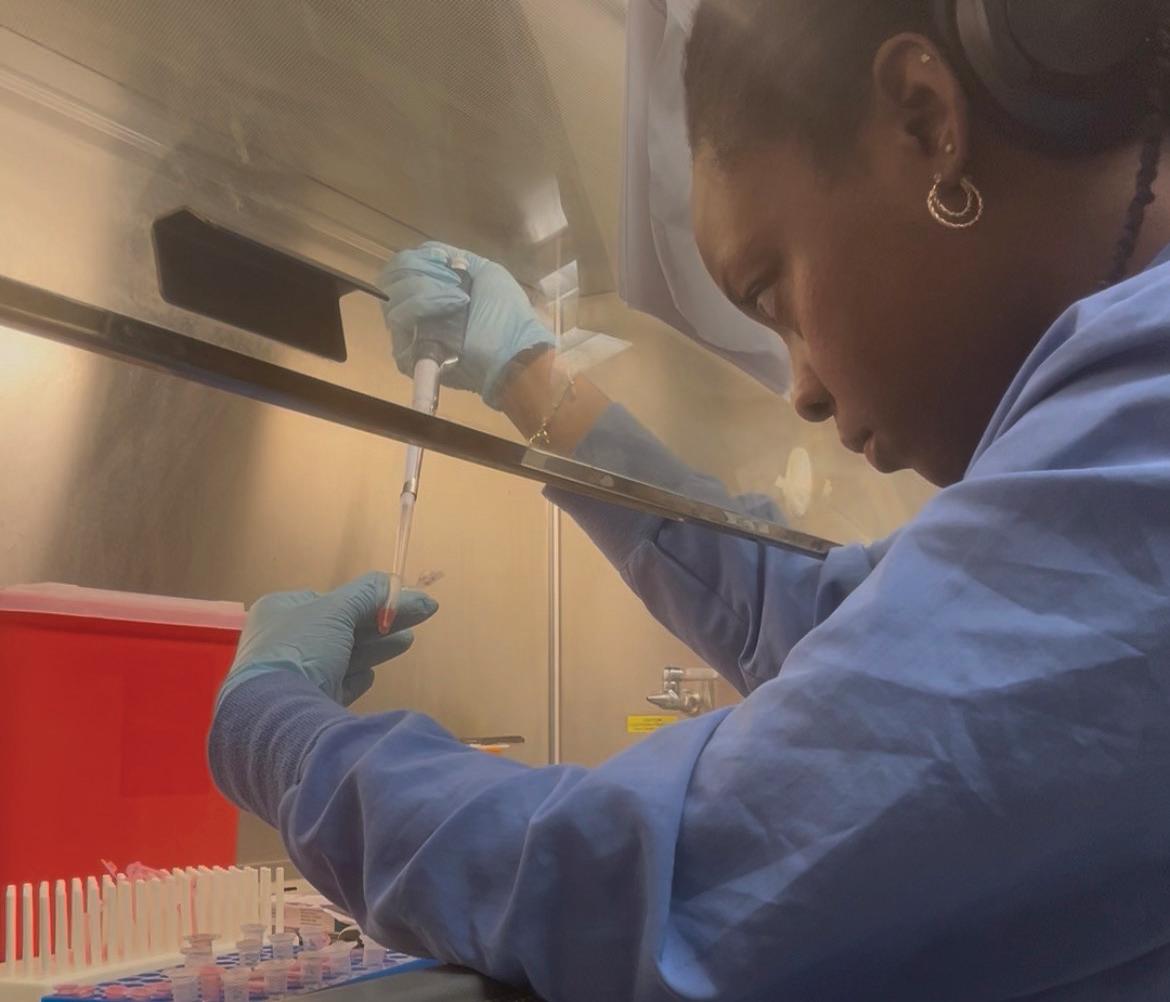 In these photos, Katherine is working with various fetal tissues for homogenization. This included cutting up tissue, measuring media, and utilizing machines such as a tissuelyser and a centrifuge.
