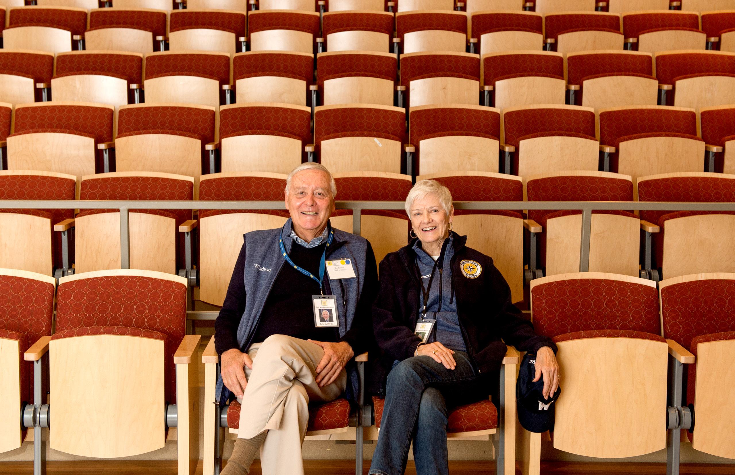 Below: Dr. Russell poses with Maureen Sweeney in the newly completed auditorium at WMS