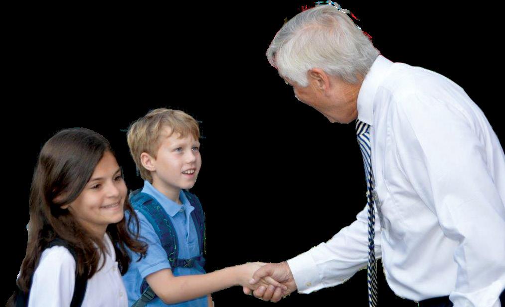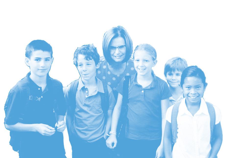 Below: Campus Head Leslie Zuckerwise poses with students on the first day of school at the Manhattan Upper West Side campus, 2015
