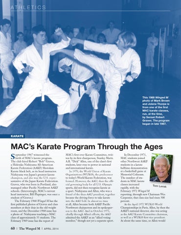 In December 1971, MAC students joined other Northwest AAKF students in a karate halftime demonstration at a basketball game at Memorial Coliseum. The number of students in MAC karate classes increased Tom Levak rapidly, with the February 1972 Winged M reporting, through new Chairman Wes Carpenter, that class size had risen 300 percent. At the April 1972 WUKO World Championships in Paris, Allen, by then the AAKF’s national director, also was acting as the AAU Karate Committee chairman, as well as a WUKO first vice president. At about the same time, so Allen would