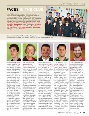 FACES IN THE CLUB The MAC Climbing Team had one of its best-ever showings at Divisional Championships, finishing third overall in the team competition. Ten of the 21 MAC climbers who competed advanced to National Championships, held in Madison, Wisconsin, in early February. Climbers headed to Nationals, along with MAC coaches, include, front row from left, Aidan Schenk, Sloane Warmkessel, Sutton Warmkessel, Jack Urness and Gabe Laurent; middle row, from left, Tori Siegel, Celia Diffely, Zak Surma and Head Coach Drew White, back row, from left, Coach Justin Rom, Brett Walker, Ryan Patridge and Coach Chi Harris.