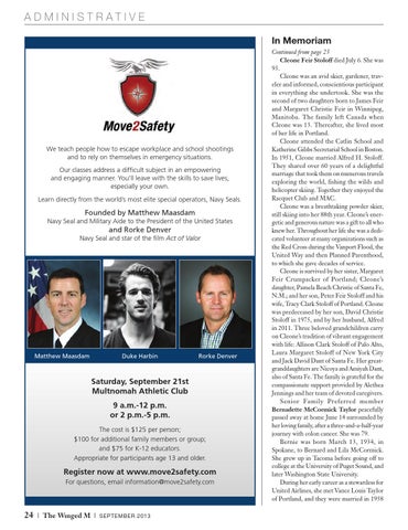 Continued from page 23 Cleone Feir Stoloff died July 6. She was 93. Cleone was an avid skier, gardener, traveler and informed, conscientious participant in everything she undertook. She was the second of two daughters born to James Feir and Margaret Christie Feir in Winnipeg, Manitoba. The family left Canada when Cleone was 13. Thereafter, she lived most of her life in Portland. Cleone attended the Catlin School and Katherine Gibbs Secretarial School in Boston. In 1951, Cleone married Alfred H. Stoloff. They shared over 60 years of a delightful marriage that took them on numerous travels exploring the world, fishing the wilds and helicopter skiing. Together they enjoyed the Racquet Club and MAC. Cleone was a breathtaking powder skier, still skiing into her 88th year. Cleone’s energetic and generous nature was a gift to all who knew her. Throughout her life she was a dedicated volunteer at many organizations such as the Red Cross during the Vanport Flood, the United Way and then Planned Parenthood, to which she gave decades of service. Cleone is survived by her sister, Margaret Feir Crumpacker of Portland; Cleone’s daughter, Pamela Beach Christie of Santa Fe, N.M.; and her son, Peter Feir Stoloff and his wife, Tracy Clark Stoloff of Portland. Cleone was predeceased by her son, David Christie Stoloff in 1975, and by her husband, Alfred in 2011. Three beloved grandchildren carry on Cleone’s tradition of vibrant engagement with life: Allison Clark Stoloff of Palo Alto, Laura Margaret Stoloff of New York City and Jack David Dant of Santa Fe. Her greatgranddaughters are Nicoya and Amiyah Dant, also of Santa Fe. The family is grateful for the compassionate support provided by Alethea Jennings and her team of devoted caregivers. Senior Family Preferred member Bernadette McCormick Taylor peacefully passed away at home June 14 surrounded by her loving family, after a three-and-a-half-year journey with colon cancer. She was 79. Bernie was born March 13, 1934, in Spokane, to Bernard and Lila McCormick. She grew up in Tacoma before going off to college at the University of Puget Sound, and later Washington State University. During her early career as a stewardess for United Airlines, she met Vance Louis Taylor of Portland, and they were married in 1958