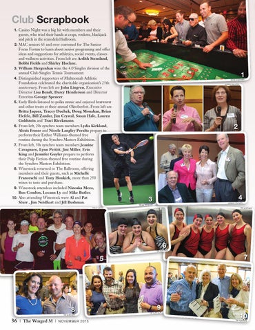 Club Scrapbook 1. Casino Night was a big hit with members and their guests, who tried their hands at craps, roulette, blackjack and pitch in the remodeled ballroom. 2. MAC seniors 65 and over convened for The Senior Focus Forum to learn about senior programing and offer ideas and suggestions for athletics, social events, classes and wellness activities. From left are Ardith Stensland, Bobbi Fields and Shirley Hoehne. 3. William Hergenhan wins the 4.0 Singles division of the annual Club Singles Tennis Tournament. 4. Distinguished supporters of Multnomah Athletic Foundation celebrated the charitable organization’s 25th anniversary. From left are John Lingren, Executive Director Lisa Bendt, Darcy Henderson and Director Emeritus George Spencer. 5. Early Birds listened to polka music and enjoyed bratwurst and other treats at their annual Oktoberfest. From left are Britta Jaques, Tracey Duchek, Doug Monahan, Brian Hefele, Bill Zander, Jim Crystal, Susan Hale, Lauren Goldstein and Traci Rieckmann. 6. From left, 20s synchro team members Lydia Kirkland, Alexis Fraser and Nicole Langley Peralta prepare to perform their Esther Williams-themed free routine during the Synchro Masters Exhibition. 7. From left, 50s synchro team members Jeanine Cavagnaro, Lynn Pettitt, Jini Miller, Erin King and Jennifer Guyler prepare to perform their Pulp Fiction-themed free routine during the Synchro Masters Exhibition. 8. Winestock returned to The Ballroom, offering members and their guests, such as Michelle Franceschi and Tony Houkirk, more than 250 wines to taste and purchase. 9. Winestock attendees included Ninoska Meza, Ben Condon, Leeann Ly and Mike Butler. 10. Also attending Winestock were Al and Pat Sturr , Jim Neidhart and Jill Bushman.