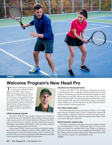 he Tennis community is excited to welcome new Head Pro Paul Reber to the MAC. Paul comes to MAC from Eugene Swim and Tennis Club. Prior to ESTC Paul served as the University of Oregon’s head coach for women’s tennis. Paul’s bio can be found in Athletic Director Ed Stoner’s Sports Shorts column on page 9 of the August Winged M. The tennis program is excited to have Reber at the helm.