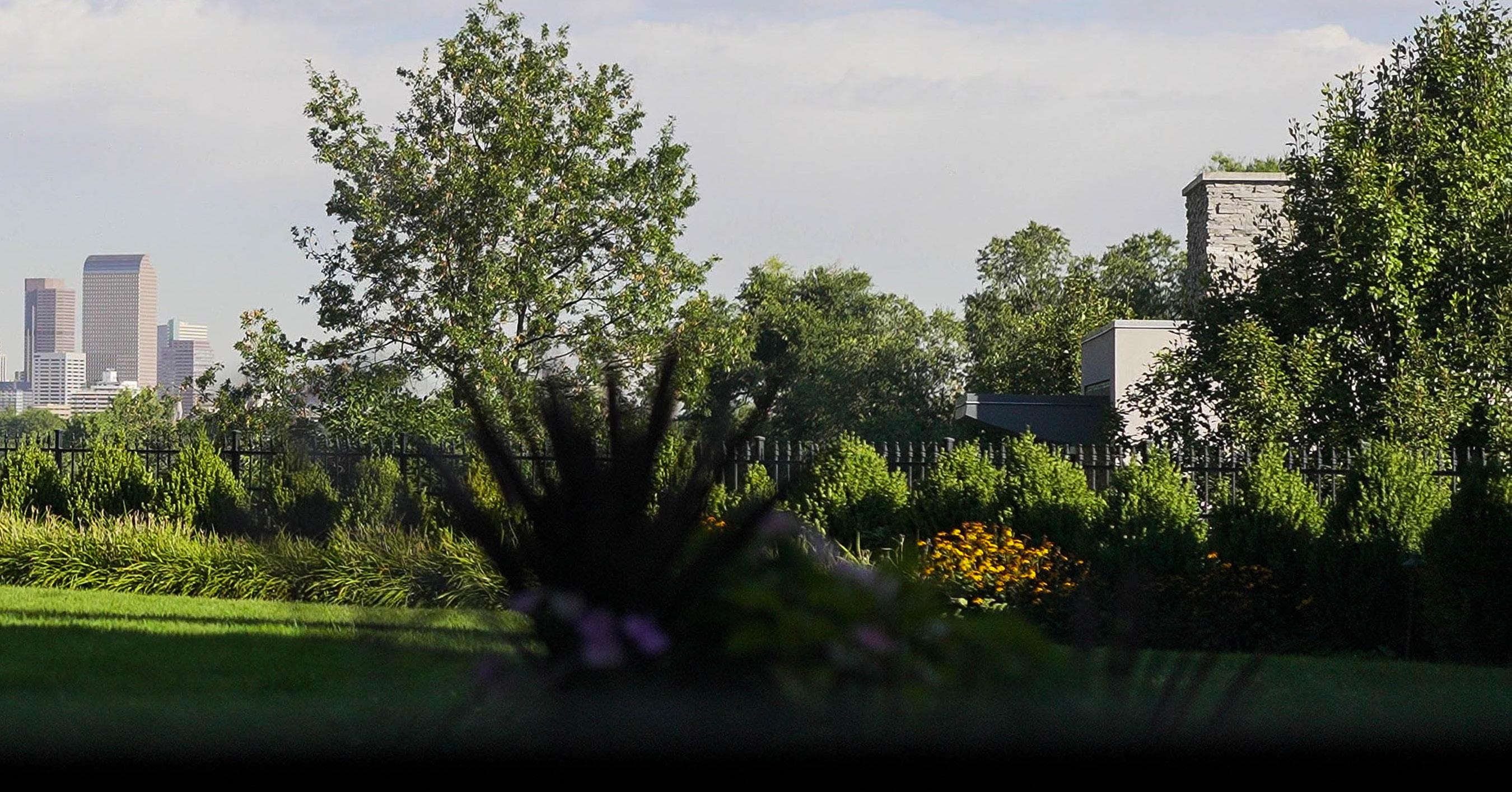 The home boasts plaster walls; high ceilings; handsome library; gracious living room; formal dining room; remodeled kitchen; an elevator servicing all three levels; and 1.3 acres of rolling lawns, English gardens, and multiple flagstone patios capturing spectacular views of the Denver Country Club and Downtown Denver skyline.