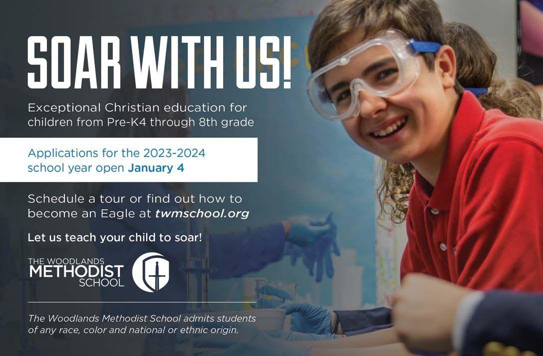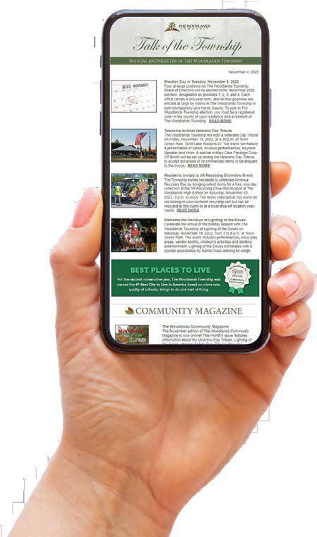 its employees. Champions Printing & Publishing, Inc. or its employees assumes no responsibility for the accuracy of any facts stated in articles submitted by others. Space does not always permit a full description of provisions of The Woodlands Covenants or Residential Development Standards being discussed. This magazine does not replace or alter The Woodlands Covenants or Residential Development Standards. Always refer to the Covenants or Standards or call the office for specific information. Copyright: The Woodlands Community Magazine is published monthly in Houston, Texas, U.S.A. by Champions Printing & Publishing, Inc., 6608 FM 1960 West, Suite G, Houston Texas 77069. Copyright © 2023. The contents of this publication may not be reproduced in whole or in part without the expressed written consent of the publisher or The Woodlands Township.
