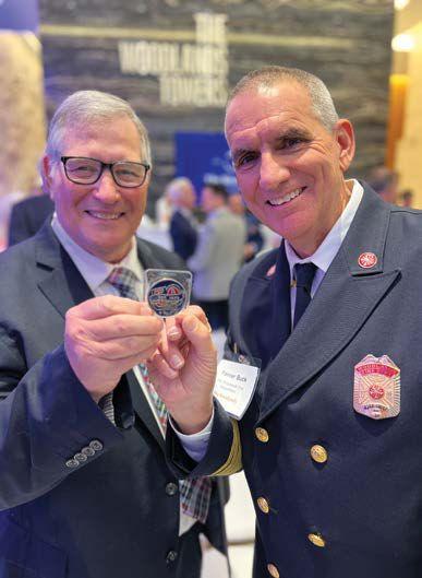 During the recent announcement of T he Woodlands 50th Anniversary, Fire Chief Palmer Buck, right, shares a challenge coin with Bob Hibbetts, one of the original firefighters in The Woodlands.