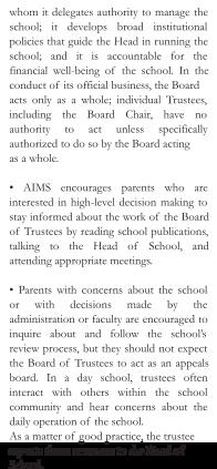 The Board of Trustees approved the PARENTS AND INDEPENDENT SCHOOLS STATEMENT from THE ASSOCIATION OF INDEPENDENT MARYLAND SCHOOLS (AIMS) as guiding principles for parent and school community relations on July 10, 2000.