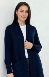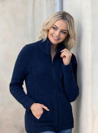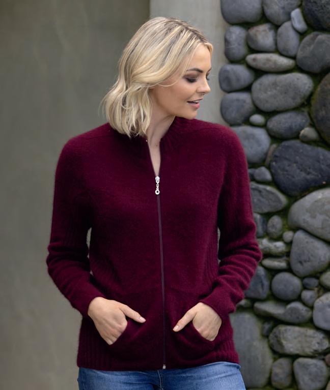 Full zip and set in sleeves. Magnolia worn with worn with 1102 Scarf Mink Page 82. Deep Sage worn with 824 Travel Scarf Page 80. 20% Possum, 70% Superfine Merino, 10% Silk.