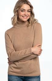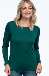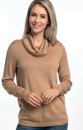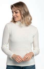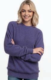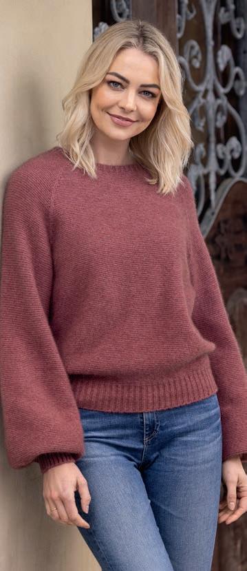 Crew neck with ribbing throughout. No bands. Natural worn with 824 Fern Travel Scarf (Page 82), Lilac worn with Rib Loop Scarf (Page 83). 20% Possum, 70% Superfine Merino, 10% Silk. Fern