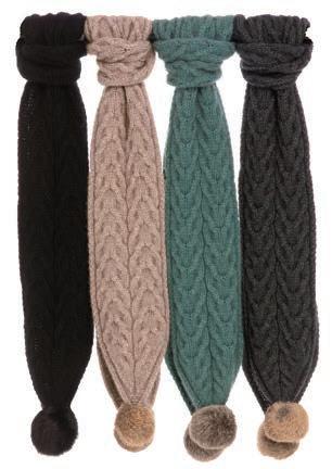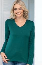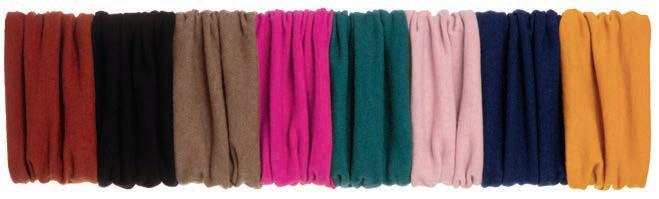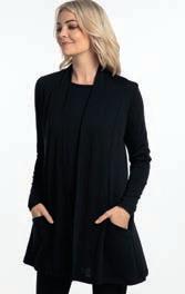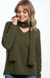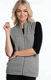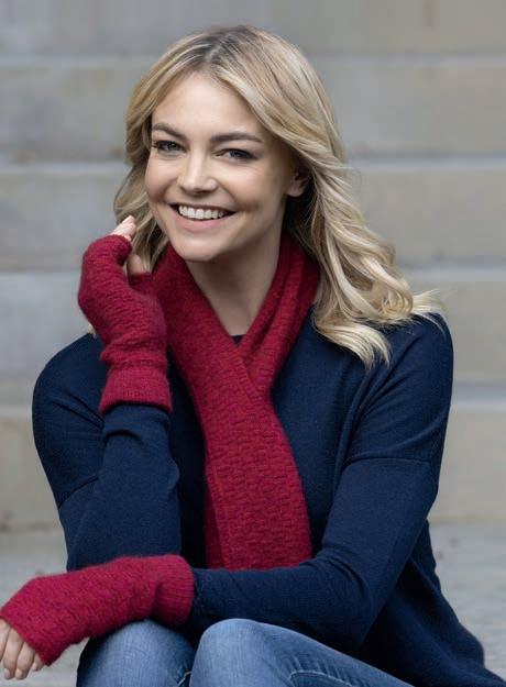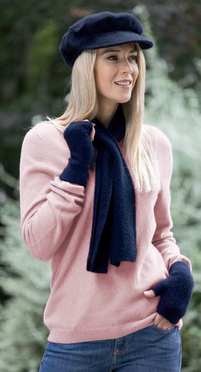 V neck with roll trim trims and side splits. Blossom and Fern worn with matching Narrow Scarf (Page 80). 20% Possum, 70% Superfine Merino, 10% Silk.