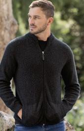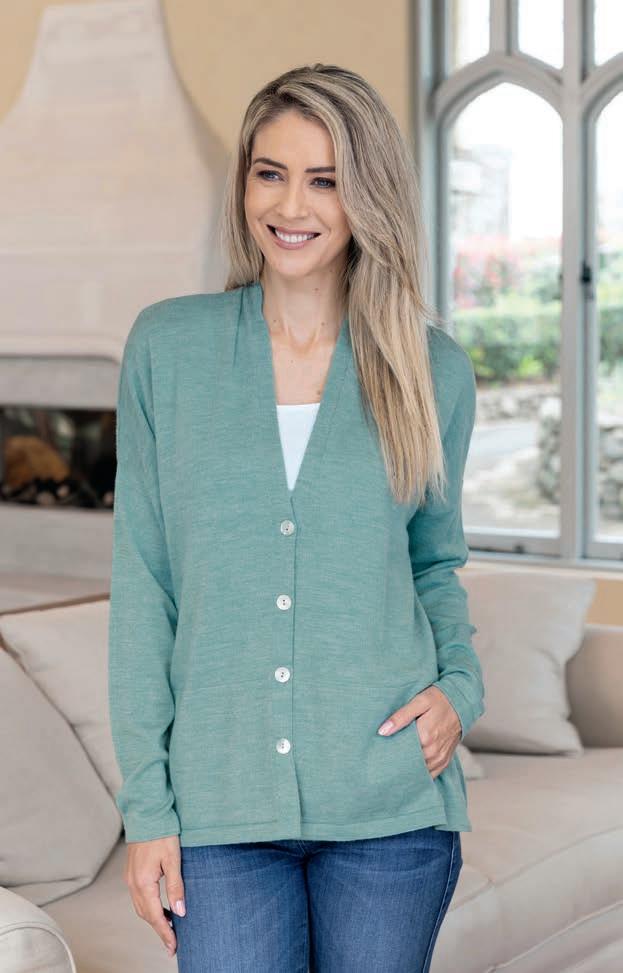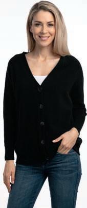 Button through V neck with raglan sleeves. Fern worn with 847 Fern Narrow Scarf (Page 80). 20% Possum, 70% Superfine Merino, 10% Silk. Black