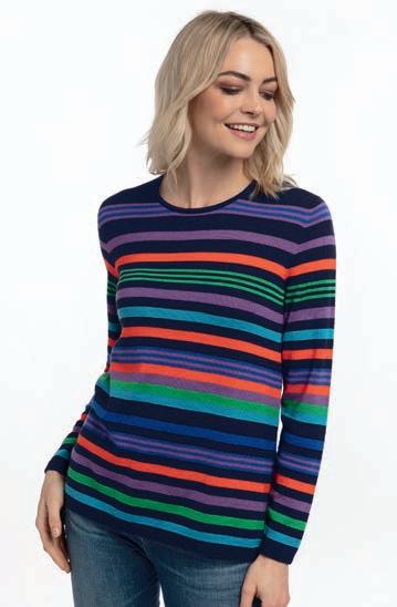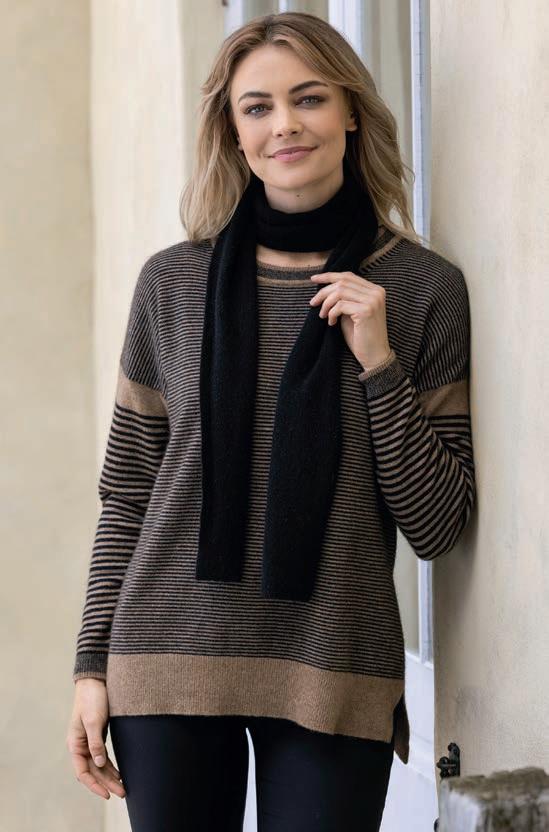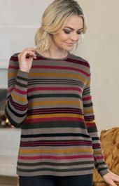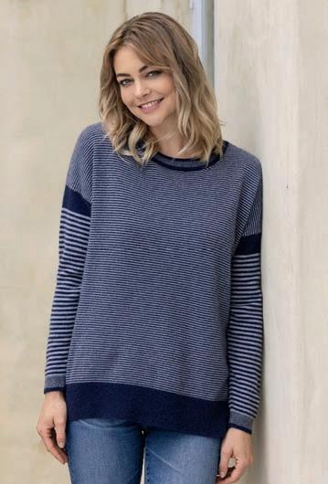 NEW STYLE Rolled hem and neckline with contrasting stripes. 20% Possum, 70% Superfine Merino, 10% Silk.