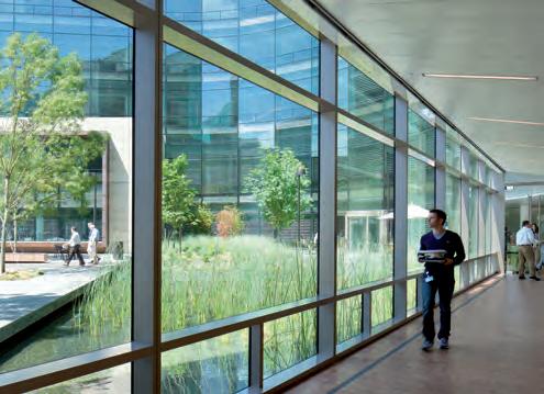 03 A landscaped courtyard returns part of the site back to its original wetland meadow and dark-water bog roots via native plantings, boardwalks, dark water and textured paving, photo by Timothy Hursley — 04 Informal meeting spaces at the end of each breezeway overlook downtown Seattle, photo by Timothy Hursley — 05 Ten foot unitized curtainwall modules maximize views and daylight, photo by Sean Airhart/NBBJ