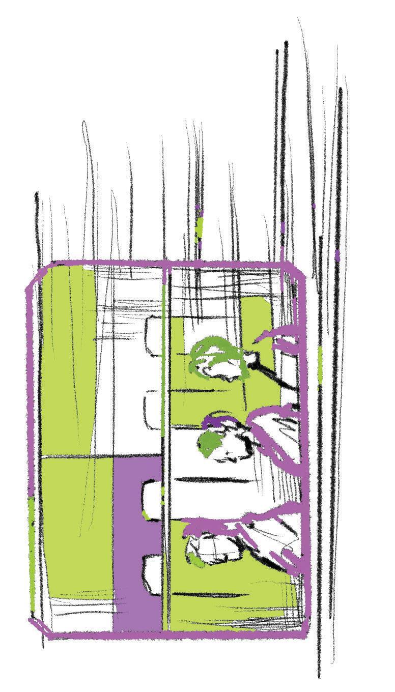 You watched as she gave the yarn form and dimension. There was nothing else to look at on this long ride. The usual tricks—podcasts, books, the view out the window—had failed. This was it. She did not pause. She did not reach for food or drink or music. If she was breathing, you couldn’t tell. You imagined she took a sweater to be just one very complicated knot.