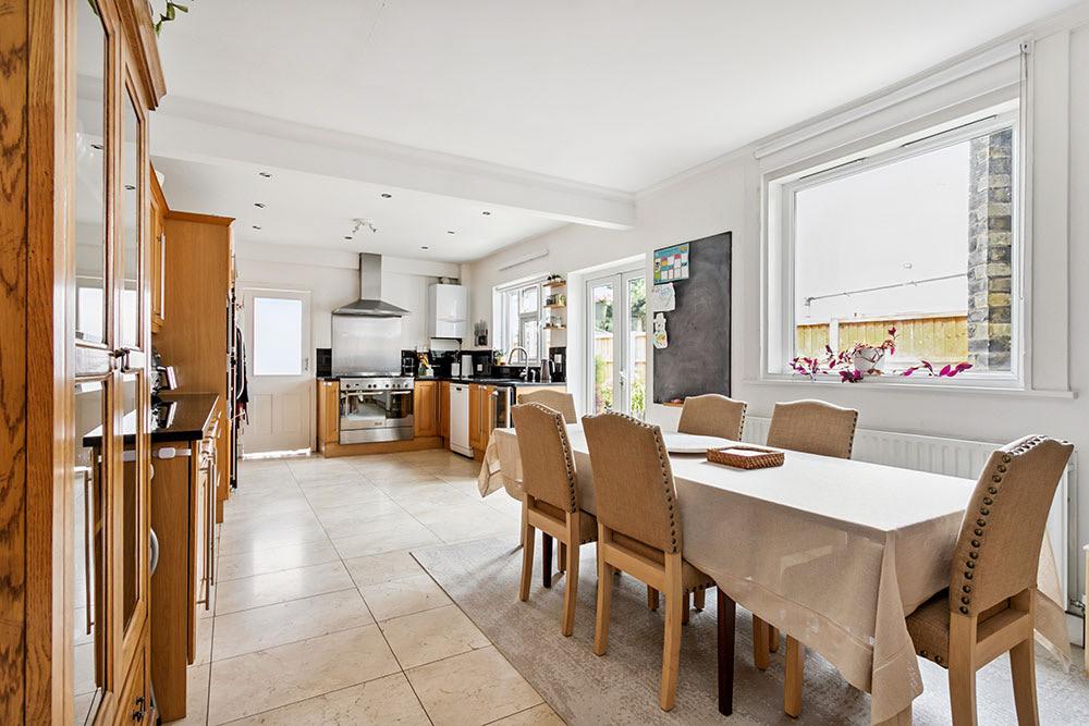 At the rear of the property lies the generous kitchen and dining area, the true hub of the home. Designed for those who love to cook and entertain, it boasts ample fitted wall and base units, integrated appliances, and plenty of space to host family and friends. Open the door to the garden, and you've got the perfect setting for alfresco dining and summer BBQs.