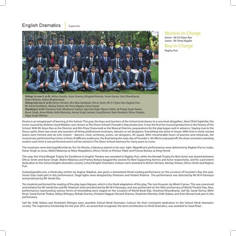 Drama is an integral part of learning at the School. This year, the boys and teachers of the School took drama to a new level altogether. Jesus Christ Superstar, the iconic musical by Andrew Lloyd Webber, was chosen as The Doon School’s Founder’s Day production. It was the first live musical production in the history of the School. With Mr Arjun Rao as the Director and Mrs Priya Chaturvedi as the Musical Director, preparations for the play began well in advance. Staying true to the Dosco spirit, there was never any question of hiring professional musicians, dancers or set designers. Everything was done in-house. With that in mind, myriad teams were formed and set into motion - dancers, choir, orchestra, actors, set designers, AV squad. After innumerable hours of practice and rehearsals, the musical was performed four times in front of different audiences, the final being the main day of Founder’s. All efforts truly paid off; the show received a standing ovation each time it was performed and it will be etched in The Doon School memory for many years to come. The musicians were led magnificently by Yuv Vir Khosla, a fabulous pianist in his own right. Magnificent performances were delivered by Raghav Puri as Judas, Karan Singh as Jesus, Malini Malaviya as Mary Magdalene, Dhruv Sirohi as Pontius Pilate and Pranoy Bohara as King Herod. This year, the Vimal Bhagat Trophy for Excellence in English Theatre was awarded to Raghav Puri, while the Kendall Trophy for Best Actor was shared between Dhruv Sirohi and Karan Singh. Malini Malaviya and Pranoy Bohara bagged the awards for Best Supporting Actress and Actor respectively, and for a persistent dedication to the School English dramatics society, School English Dramatics Colours were awarded to Rohan Shriram, Akshay Sharan, Dhruv Sirohi and Raghav Puri. Godse@gandhi.com, a Hindi play written by Asghar Wajahat, was given a dramatized Hindi reading performance on the occasion of Founder’s Day this year. Senior boys took part in this performance. Stage lights were designed by Shantanu and Vedant Khanna. The performance was directed by Mr M H Farooqui and produced by Mr Samik Das. Ten students performed the reading of the play Jayez Hatyare, which is the Hindi adaptation of the play, The Just Assassin, by Albert Camus. This was conceived and initiated by Mr Samik Das and Mr Dhanesh Joshi and directed by Mr M H Farooqui, and was performed on the 50th anniversary of World Theatre Day. Also, performances representing various forms of storytelling were staged on the occasion of World Book Day. Shashvat Dhandhania, Saif Ali, Sanat Verma, Mihir Kiran, Sanat Kumar Thakur, Aditya Dhingra, Rishab Sharma, Vrindam Nagpal, Shivank Sharma, Shubham Khemka, Vidit Sidana, and Asim Bansal took part in this perfomance. Saif Ali, Vidit Sidana and Shubham Dhingra were awarded School Hindi Dramatics Colours for their consistent dedication to the School Hindi dramatics society. The Superama Scholarship for the year 2011, an award that recognizes the best contribution to Hindi Dramatics, was awarded to Saud Khan.