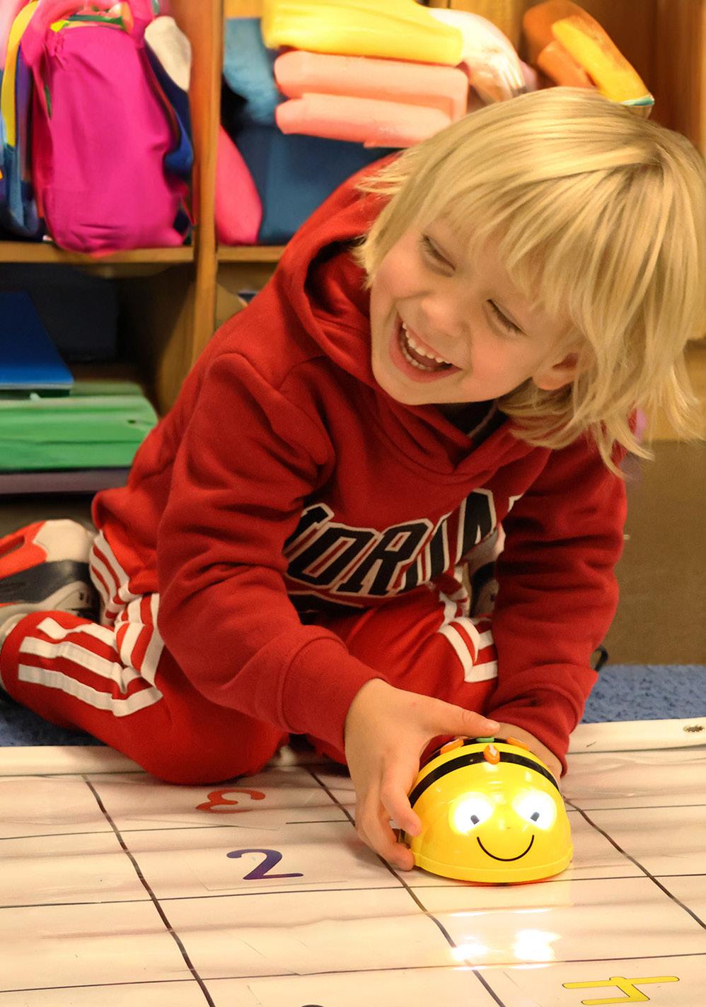For our JK, SK and Grade 1 students, the journey to STEAM literacy begins when they learn to program a floor robot that looks like a bumblebee. By pushing directional keys on “Bee-bots”, students are commanding them to move forward, backward, left or right. The Bee-bots help the children learn counting, directional language, logical-sequential thinking, step-by-step instructions, problem-solving and some of the basic concepts of coding. They also discover that debugging your errors is a normal part of coding.