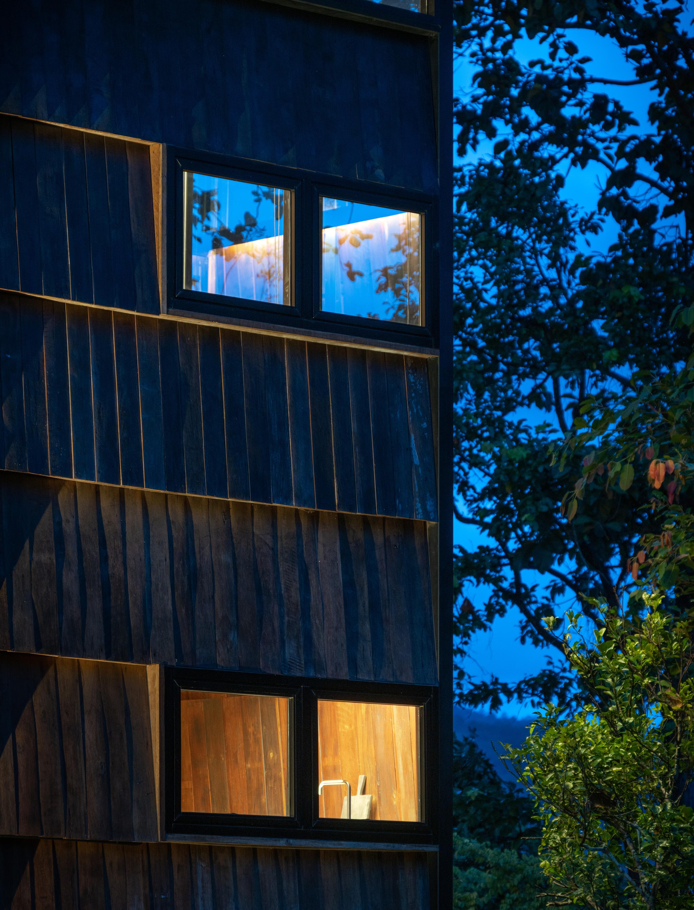 A small cabin in the middle of the forest has a solid façade composed almost entirely of charred timber cladding. The façade acts as an element that creates a first impression on visitors and is also the essence of the project. It is in line with the essence of the architectural approach of Sher Maker, an architectural practice based in Chiang Mai that focuses on working with local artisans and has an interest in developing design methods that will allow for what they call "a high level of human expression." This modest architecture reflects their process of working and thinking, which contributes to the powerful and meaningful architecture.