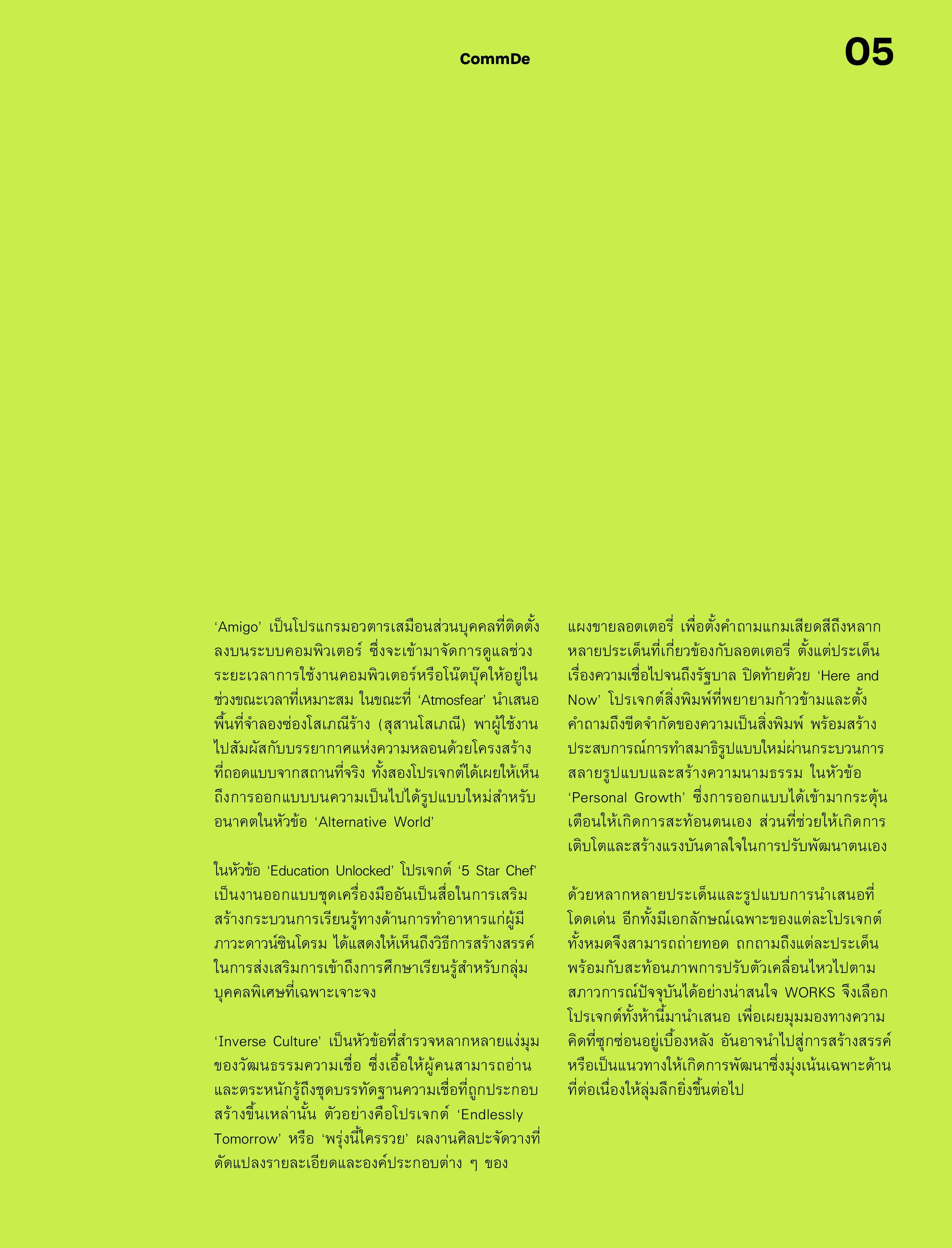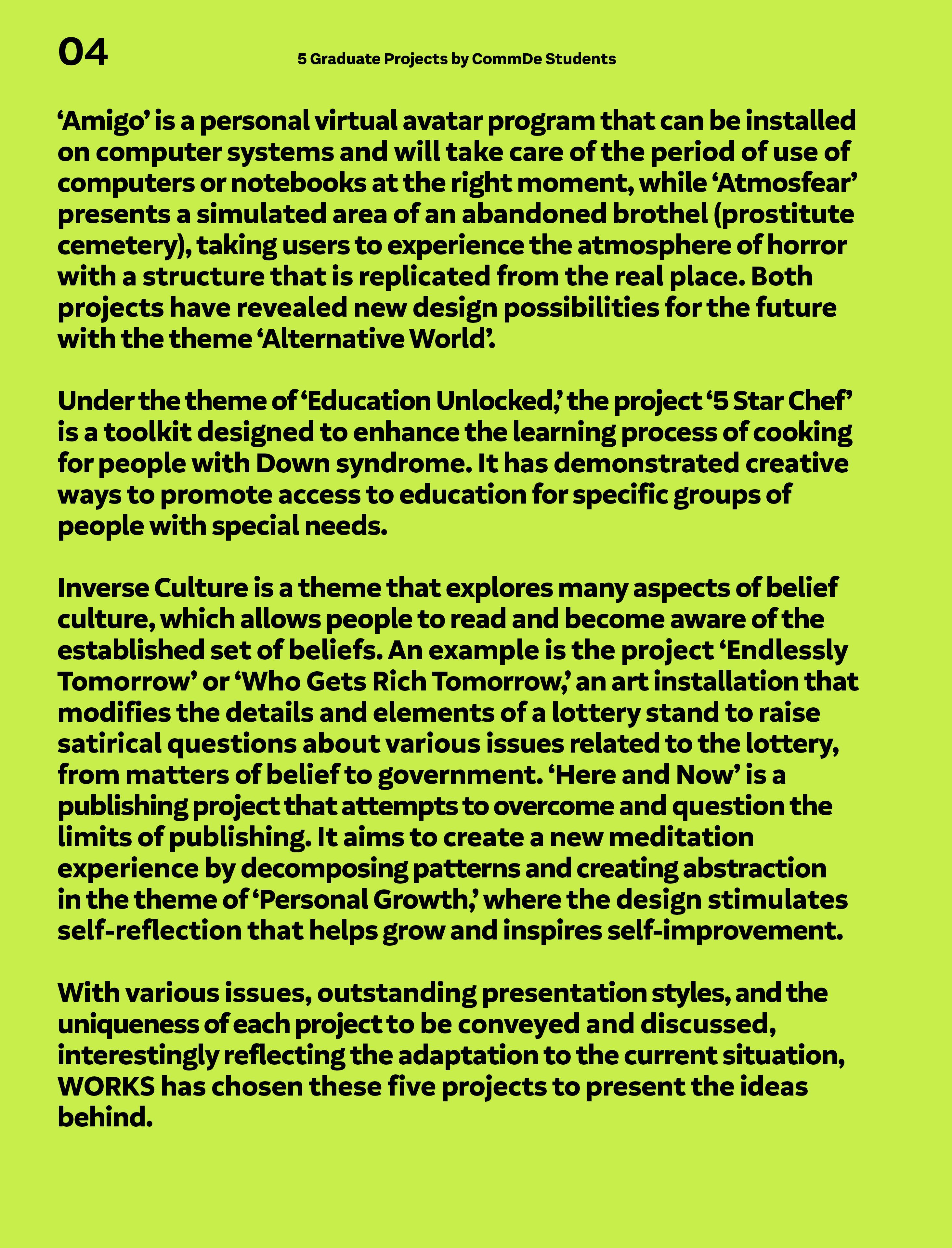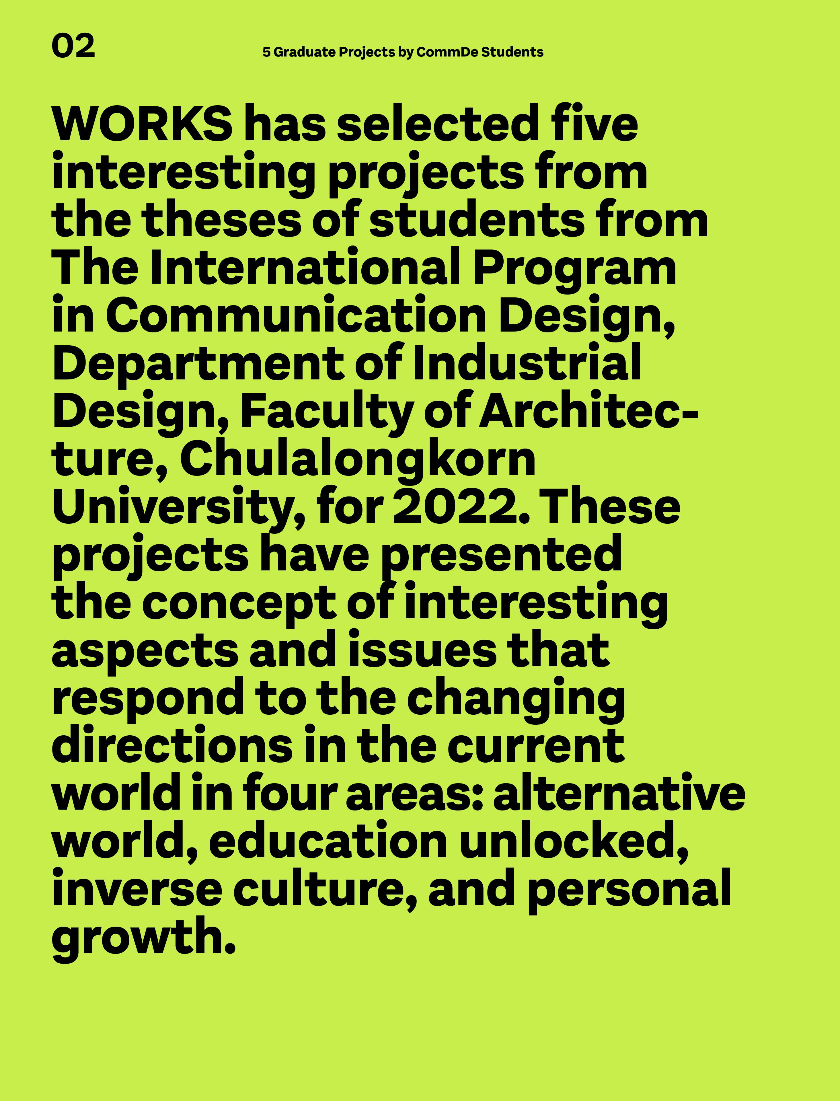 In this issue, WORKS has selected five projects by the graduate students of the International Program in Communication Design program, Faculty of Architecture, Chulalongkorn University, for 2022.