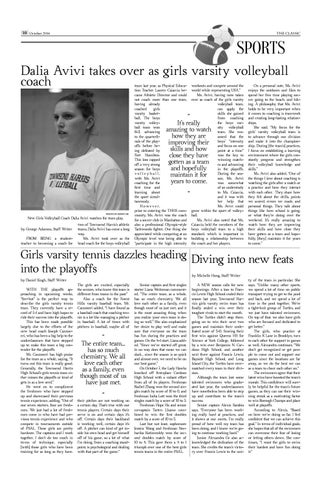 SPORTS Dalia Avivi takes over as girls varsity volleyball coach team last year, as Physical Education Teacher Lauren Caiaccia became Athletic Director and could not coach more than one team, having already coached girls varsity basketball. The boys varsity volleyball team won 8-2, advancing to the quarterfinals of the playoffs before being defeated by Fort Hamilton. This loss capped off a very strong season for boys volleyball, with Ms. Avivi coaching for the first time and learning about the sport simultaneously. H o w e v e r, prior to entering the THHS community, Ms. Avivi was the coach for a soccer club in Manhattan and also a professional Olympic-style Taekwondo fighter. One thing she appreciated while competing at an Olympic level was being able to “participate in the high intensity
