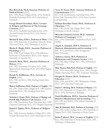 Michael R. Bray, D.M.A., Professor of Music (1996) B.A., 1975, University of Northern Colorado; M.M., 1990, and D.M.A., 1993, University of Arizona. Martin E. Bright, Ed.D., Associate Professor of Psychology (2002) B.A., 1988, Thiel College; M.A., 1990, Edinboro University of Pennsylvania; Ed.D., 2005, Argosy University of Sarasota, Fla. David R. Buck, Ph.D., Associate Professor of History (2005) B.A., 1992, University of Dayton; M.A., 1995, Slippery Rock University; Ph.D., 2002, West Virginia University. Brenda K. DelMaramo, M.A., Lecturer of English (1989) B.A., 1984, and M.A., 1986, Bowling Green State University. Mark J. DelMaramo, Ph.D., Professor of English (1989) B.S., 1981, Clarion State College; M.A., 1983, Gannon University; Ph.D., 1991, Bowling Green State University.