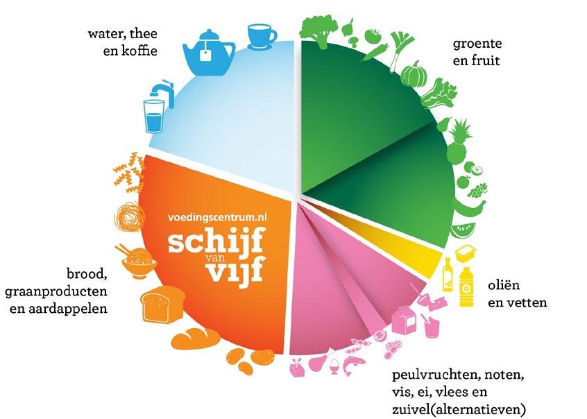 Het model van het Voedingscentrum dat helpt om gezond en gevarieerd te eten, verdeeld in vijf vakken.