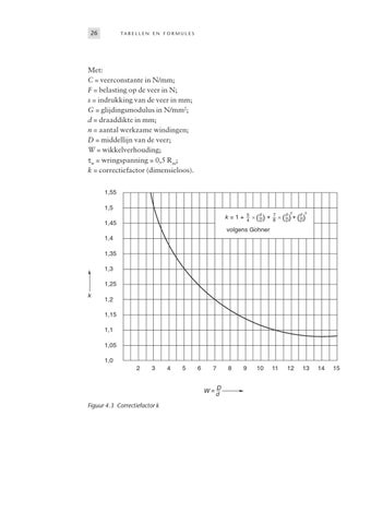 Met: C = veerconstante in N/mm; F = belasting op de veer in N; s = indrukking van de veer in mm; G = glijdingsmodulus in N/mm2; d = draaddikte in mm; n = aantal werkzame windingen; D = middellijn van de veer; W = wikkelverhouding; τw = wringspanning = 0,5 Rm; k = correctiefactor (dimensieloos). 1,55 1,5