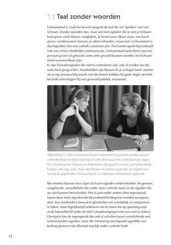 1.1 Taal zonder woorden Lichaamstaal is zoals het woord aangeeft de taal die we ‘spreken’ met ons lichaam. Zonder woorden dus, maar wel met signalen die je met je lichaam kunt geven zoals blozen, wegkijken, je benen over elkaar slaan, een hand geven, wenkbrauwen fronsen, je adem inhouden, enzovoort. Lichaamstaal is dus beperkter dan non-verbale communicatie. Dat laatste speelt bijvoorbeeld ook een rol bij schriftelijke communicatie. Lichaamstaal moet direct aan een persoon gezien of gehoord, soms zelfs gevoeld kunnen worden; het lichaam moet waarneembaar zijn. Er zijn lichaamssignalen die niet te controleren zijn, ook al zouden we dat soms heel graag willen. Voorbeelden zijn blozen als je verlegen bent, zweten als je erg zenuwachtig wordt, met de knieën knikken bij grote angst, een bibberende stem krijgen bij een gevreesd publiek, enzovoort.