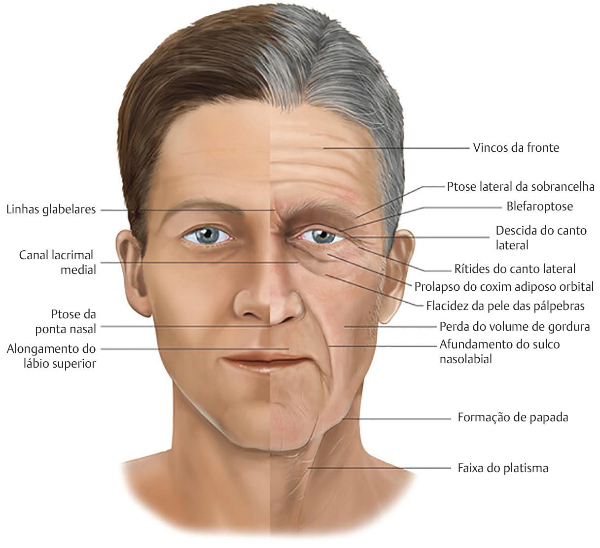 Fig. 1.3 Características da face masculina envelhecida (Reproduzida com permissão de Leath-erbarrow B, ed Oculoplastic Surgery 3rd Edition New York: Thieme; 2019 )