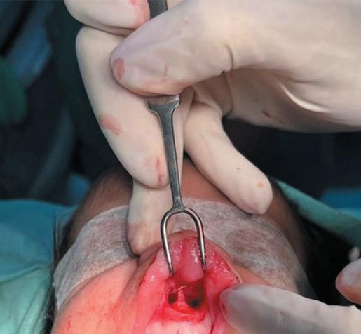 A abordagem endoscópica endonasal é uma técnica cirúrgica alternativa e recente para tratamento da ECAP. Nela, a incisão na mucosa lateral nasal permite acesso à abertura piriforme óssea, que é removida com cinzel ou broca. A mucosa é então reposicionada e suturada para cobrir o osso, reduzindo risco de cicatrizes e granulação. Quando essa cobertura é eficaz, evita-se o uso de stents, optando-se por splints de silicone no septo para prevenir sinéquias. Essa técnica pode minimizar complicações da via sublabial, como lesões dentárias, estenose do ducto nasolacrimal e distúrbios no crescimento facial, embora ainda seja considerada experimental.5