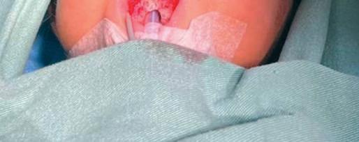 9. Continuar o broqueamento até que a cavidade nasal possa acomodar bilateralmente um tubo endotraqueal de calibre 3,5 (é possível manter um dilatador na cavidade nasal oposta durante a perfuração, para evitar o deslocamento do septo nasal).