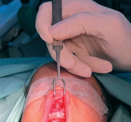 7. Realizar dissecção subperiosteal para expor a espinha nasal anterior e o assoalho de cada narina, permanecendo anterior aos cornetos inferiores para evitar lesão ao sistema nasolacrimal (Fig. 1-3).