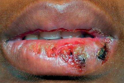 Fig. 1-17. Escara em mucosa labial inferior, ocasionada por queimadura após contato com soda clorada usada em tratamento endodôntico.