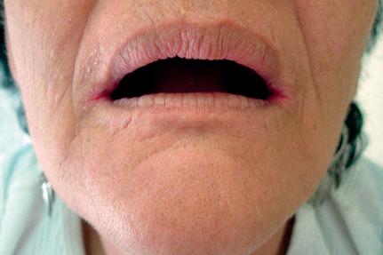 1-12. Queratose superficial em vermelhão do lábio inferior em paciente com diagnóstico clínico de queilite esfoliativa.
