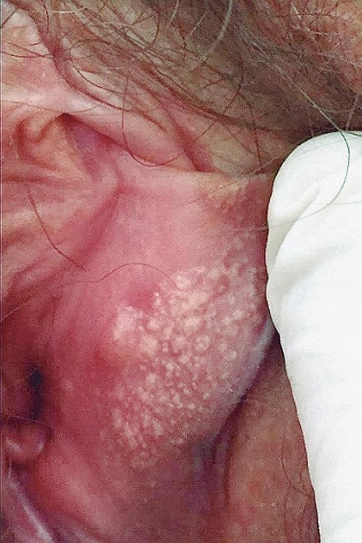 diferem do condiloma acuminado por serem simétricas e lineares, sua consistência ser macia, suas pontas arredondadas e não acuminadas, de coloração rósea, a mesma da mucosa, e sua base ser individual. Além disso, no teste do ácido acético a 2%-5% não apresenta acetorreatividade, apesar de essa reação hoje ser considerada inespecífica, podendo corresponder à infecção pelo HPV, mas também podendo surgir na presença de hiperceratose ou espessamento da pele (Fig. 1-8).