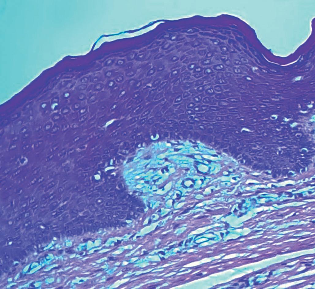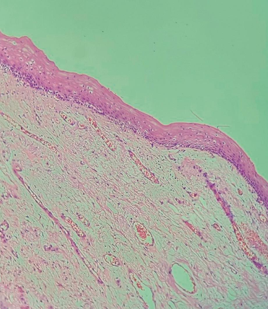 1-5. Pequeno lábio. Pele com epiderme constituída por epitélio escamoso pluriestratificado não-queratinizado sobre estroma conjuntivo. Observar a ausência de folículos pilossebáceos (HE, 10x).